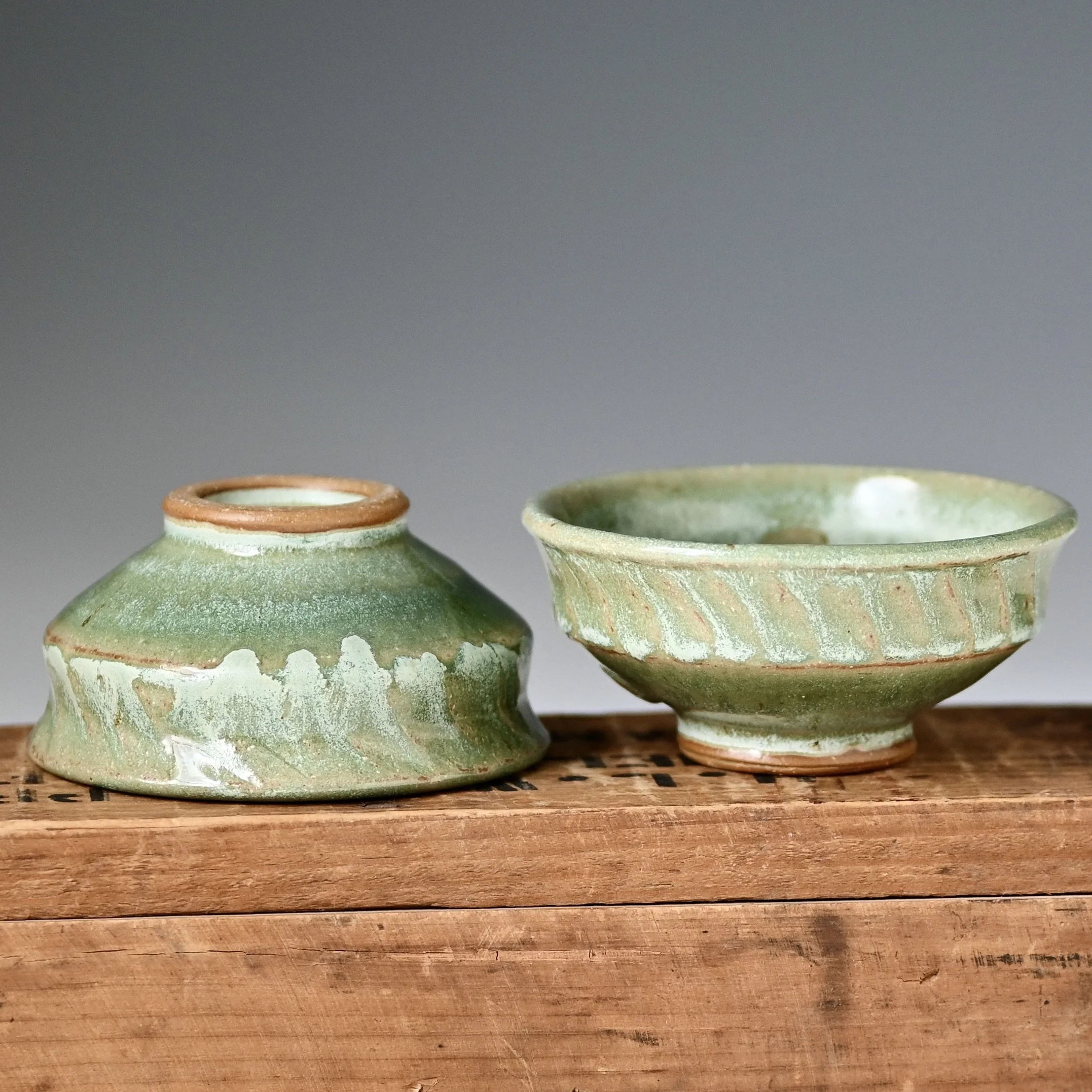 Stacked ceramic bowls with polka dot design on a wooden surface.